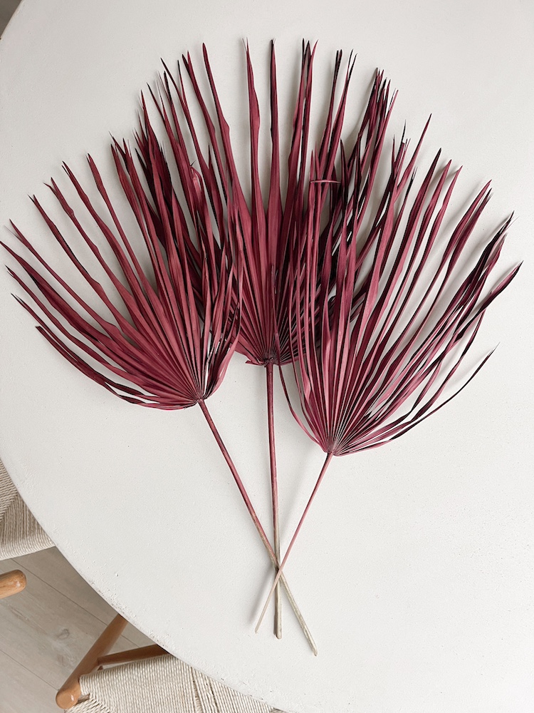 Breng een tropische sfeer in huis met deze prachtige grote gedroogde Chamaerops bladeren welke bordeaux zijn geverfd. Gebruik ze als wanddecoratie, zet ze in een mooie vaas voor een stijlvolle minimalistische look of combineer ze met andere gedroogde bloemen voor een statement arrangement. Deze bladeren worden per set van 3 stuks verkocht.